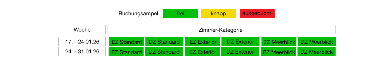 Hier findest Du einen Überblick über die aktuelle Verfügbarkeit der Zimmer in den jeweiligen Wochen: