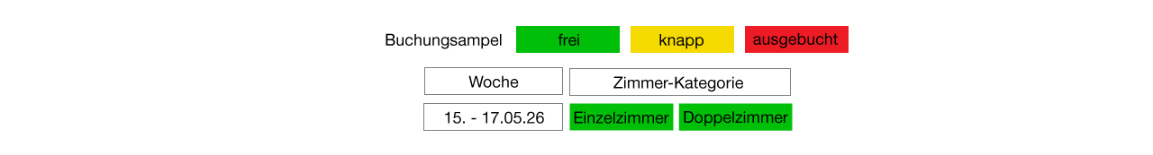 Hier findest Du einen Überblick über die aktuelle Verfügbarkeit der Zimmer in den jeweiligen Wochen:
